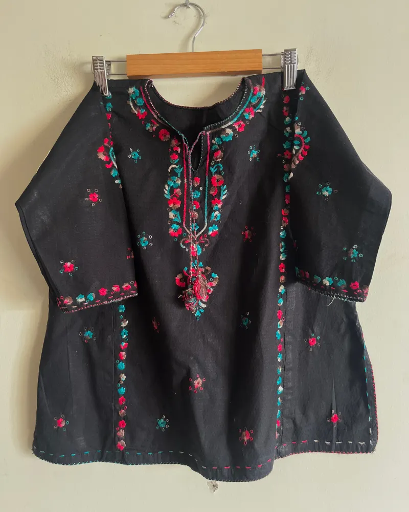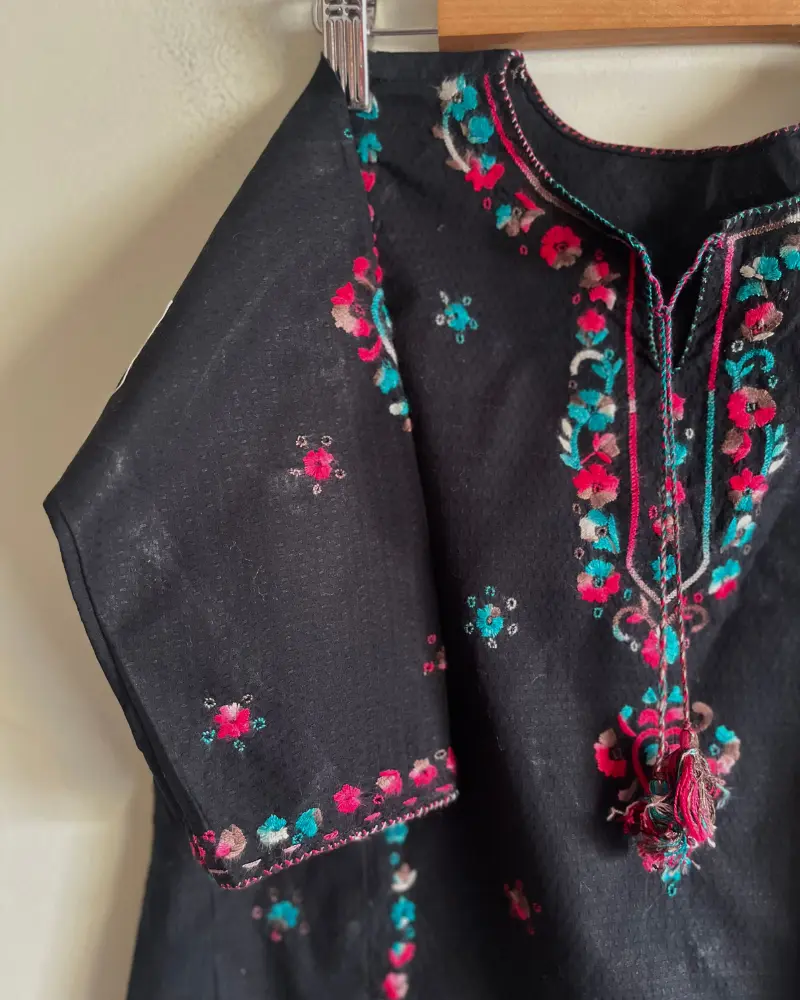 This stunning Black outfit features exquisite hand embroidery with traditional pakka kaam, known for its fine craftsmanship and intricate detailing. Paired with a matching black shalwar is a perfect choice for special occasions, offering elegance and timeless charm.